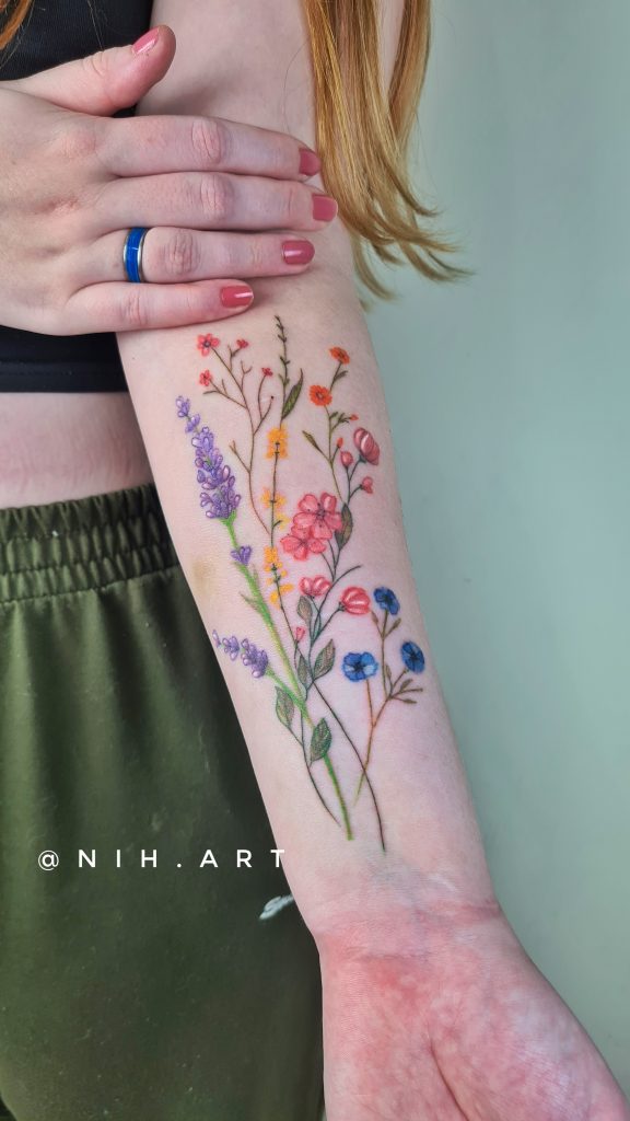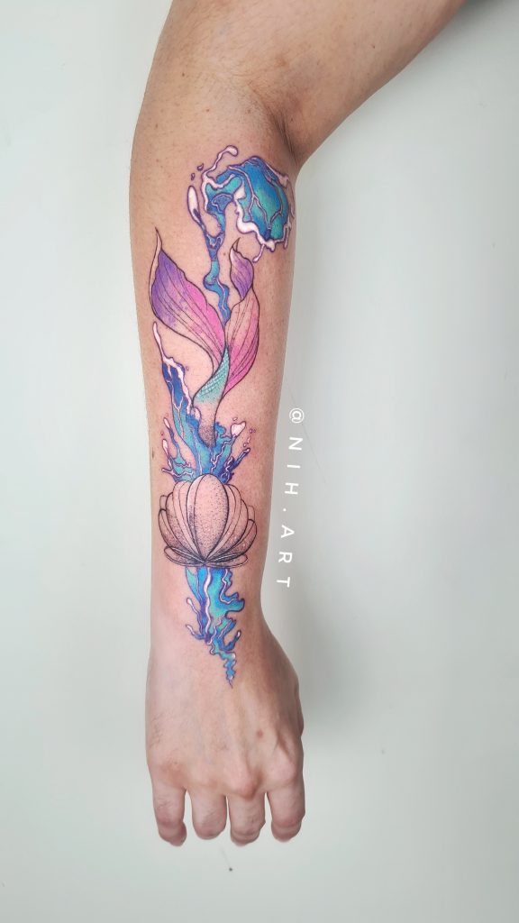 “Meu nome é Aline, mas podem me chamar de Nih! Sou química formada e larguei tudo pra viver da minha arte haha. Sou tatuadora há 2 anos e meio, e completamente apaixonada pela arte e toda transformação que ela pode causar na nossa vida e dia a dia. Trabalho com bastante coisa diferente! Fineline, florais, aquarelas, microrealismo, blackwork; e amo uma boa reforma ou cobertura. Não gosto de me definir em um único estilo, afinal amo essa fluidez que só a arte torna possível.”