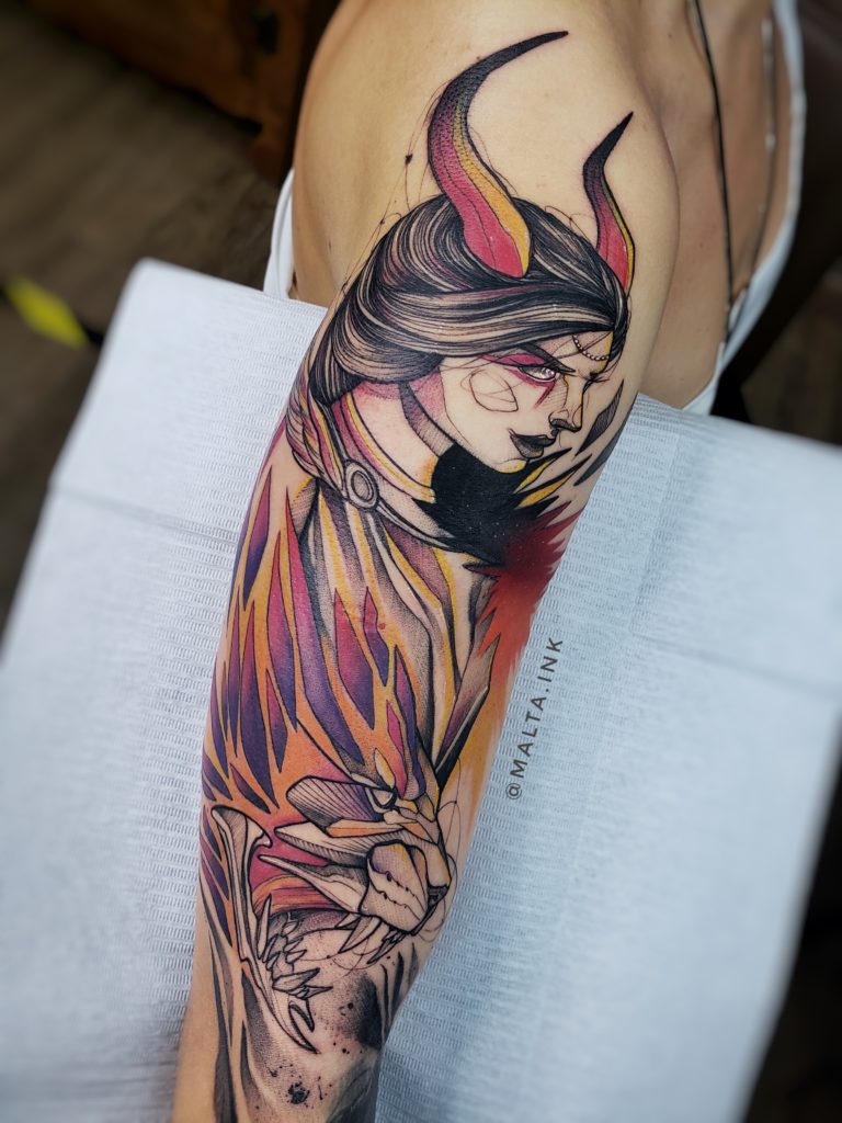 “Comecei minha trajetória de artista em 2010 como pintora. No decorrer dos anos estive em contato com a arte e com o mundo da tatuagem. Tatuo há cerca de seis anos. Não sei se tenho estilo definido, encaro cada projeto como algo único e tento representar neles a minha linguagem. Sou uma apaixonada por cores e pelas histórias. Minha inspiração vem de muitos artistas desde colegas a obras clássicos da história da arte.”