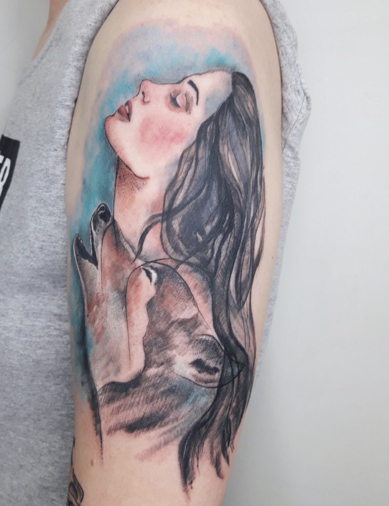 “Desde pequena era apaixonada por desenhar. Quando cresci, entrei na faculdade de Design Gráfico, foquei no ramo da ilustração. Em 2014 tive meu primeiro contato com uma máquina de tatuagem, e minha paixão pela tattoo só aumentou. Como sempre fui atraída por cores, meu estilo acaba também puxando elementos da técnica aquarela e sketch. Gosto de utilizar tanto temas da natureza quanto o universo geek. Tenho diversas inspirações como ilustradores, aquarelistas, escultores e uma lista enorme de outros tatuadores.”