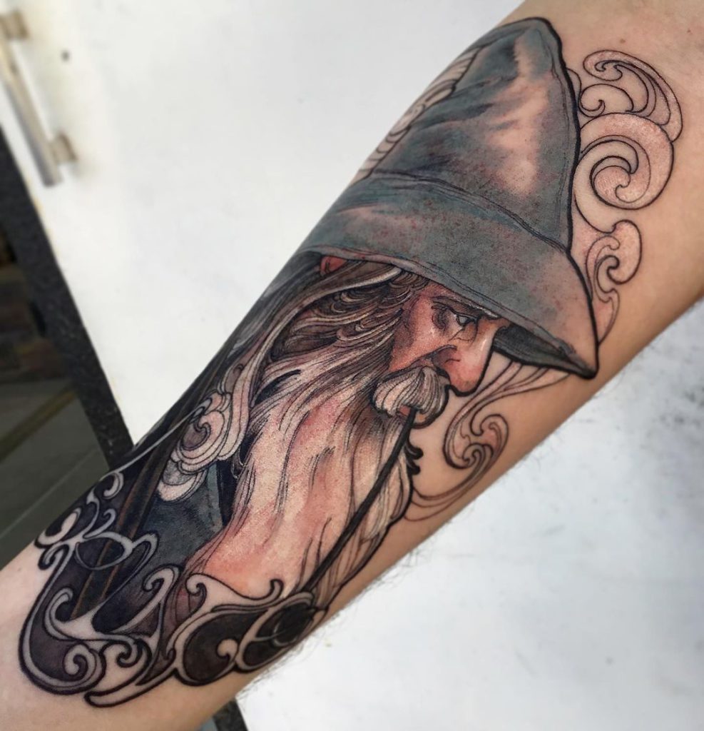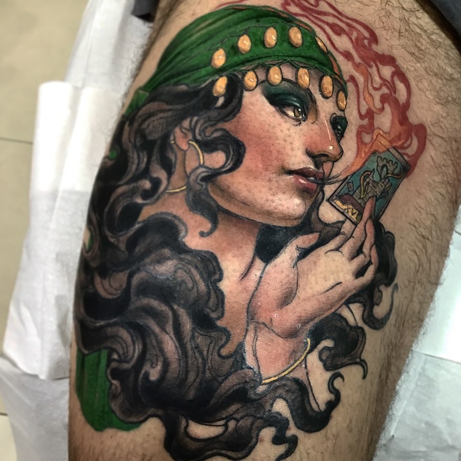 “Atualmente moro em BH, mas sou carioca e foi lá no RJ que começou minha trajetória na tatuagem em 2009 como aprendiz do tatuador Tuninho Silva. Desde então, também fiz faculdade de Gravura na UFRJ que foi o momento em que desenvolvi meu estilo autoral. Com isso tenho referências em filmes, livros e ilustração de fantasia que é o gênero mais influente no meu trabalho, sempre com uma pegada mais mística e mágica.”