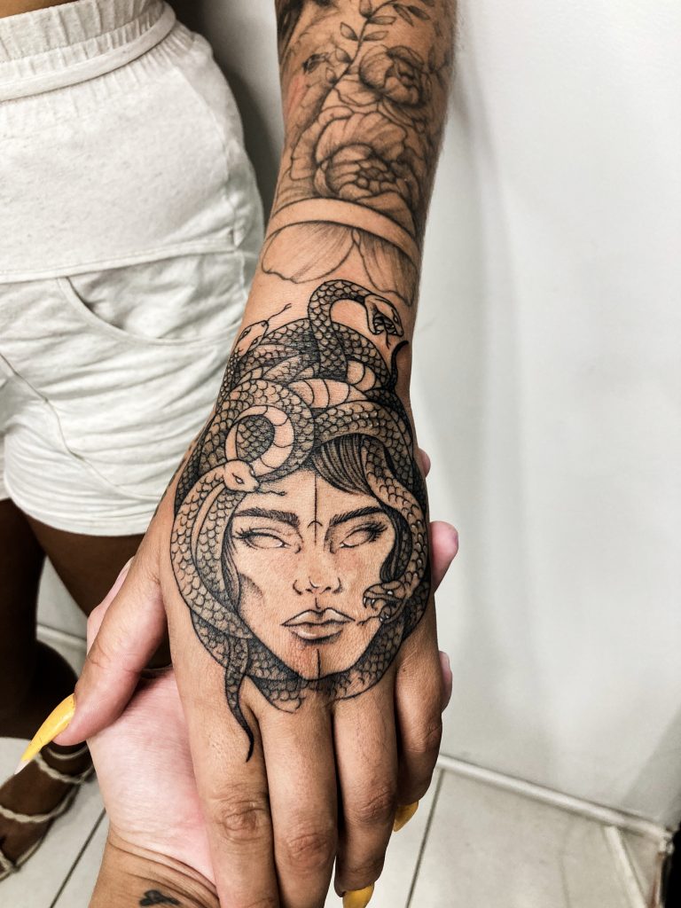 “Me chamo Nane Medusa, atuo há 8 anos na tatuagem e eu amo misturar estilos. Nessas artes vocês verão uma mistura de estilos, nos quais eu uso somente tinta preta sólida. Desta forma, a minha arte cicatrizará de uma forma perfeita, sem precisar de retoques. Na criação das minhas artes converso com cada pessoa, para gerar uma arte única com a essência da pessoa com a minha própria essência. Cada arte leva um pouco de mim, pois me entrego de corpo e alma. Trabalho somente com exclusividades. Tatuagens para todos os corpos e cores, é o meu lema. Minhas maiores inspirações são estudos de fotografias de pinturas indígenas e incas, dentre outros.”