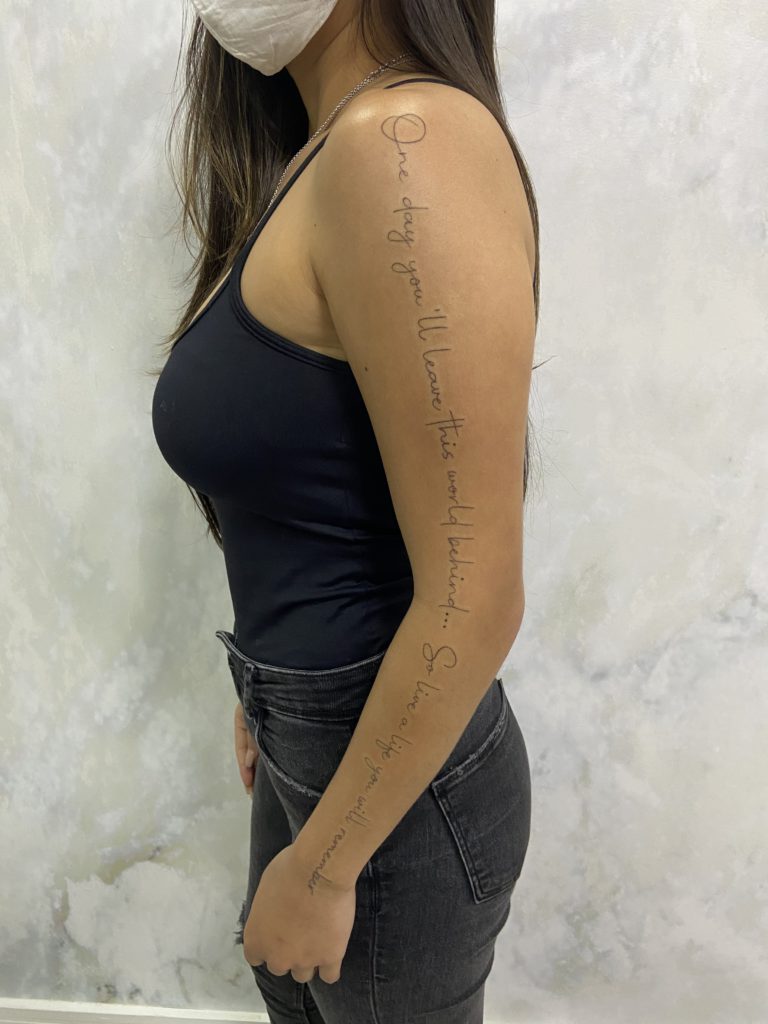 Com vocês Merello: “Nasci e cresci na grande cidade de São Paulo Capital. Em 2016 aos 23 anos, foi quando comecei a ganhar a vida eternizando as artes na pele. Hoje moro em Brasília, onde tenho um estúdio sofisticado, com atendimento personalizado voltado as mulheres. Meus estilos são: fineline, botânico e caligrafia.” Achei chic!