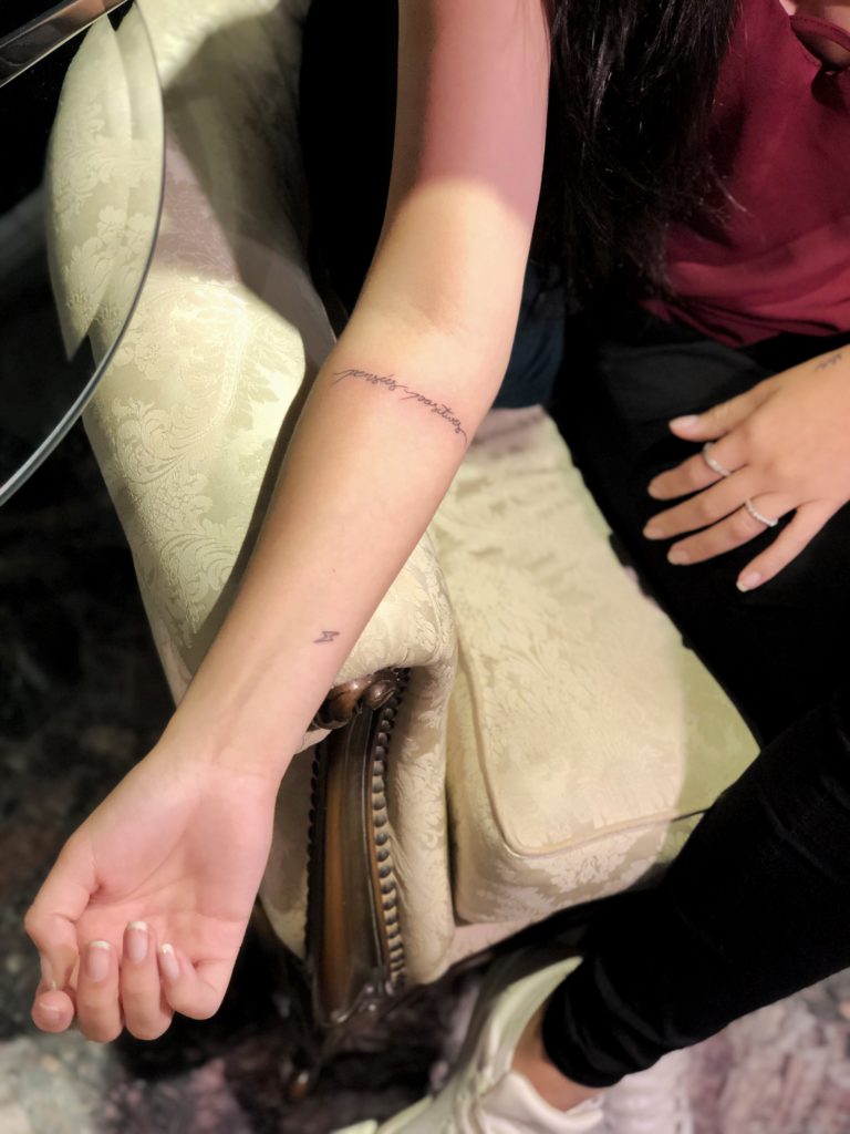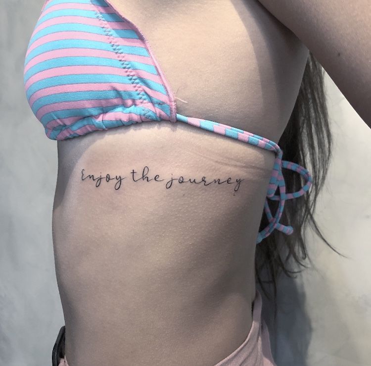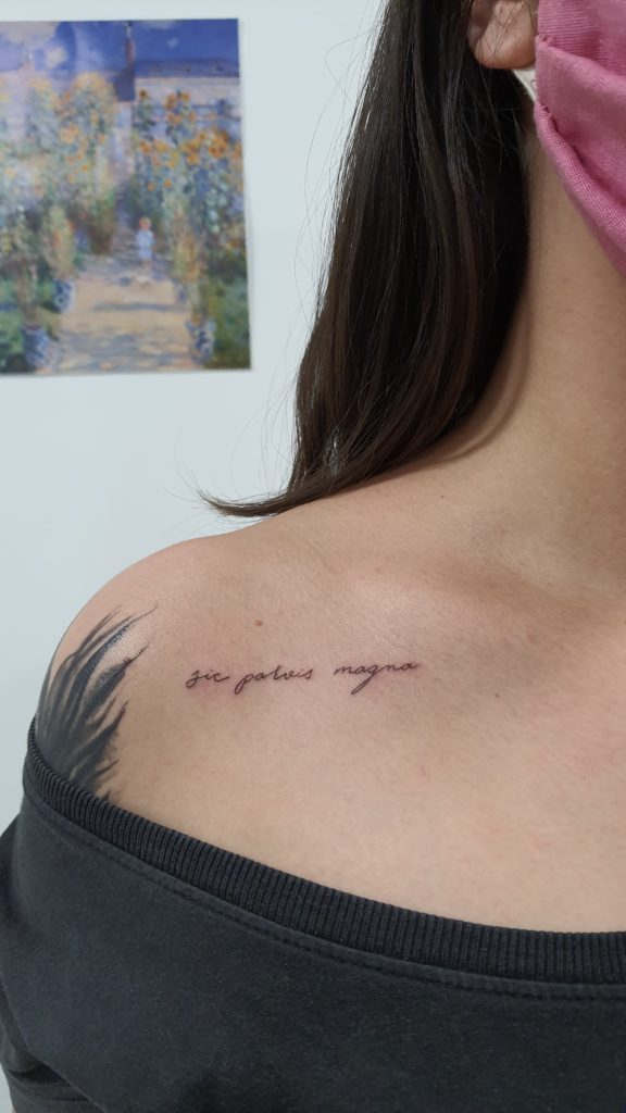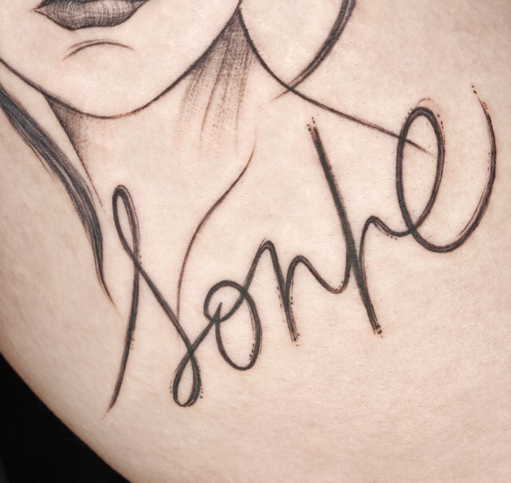 A Carla é um amor: “Iniciei minha carreira na tatuagem devido ao encanto que tinha pela arte e principalmente o que essa arte podia fazer para melhorar a auto estima das pessoas, como no caso da reconstrução de areola mamária. Desde 2015 estou na área empenhada em aprender sempre mais. Minha mãe que também era artista me ensinou muito e sempre me apoiou nessa minha decisão. Hoje faço apenas trabalhos autorais, delicados e minimalista, no estilo fineline e mini realismo. E sou apaixonada por essas tattoos escritas.”