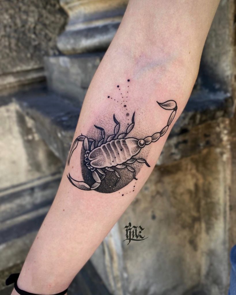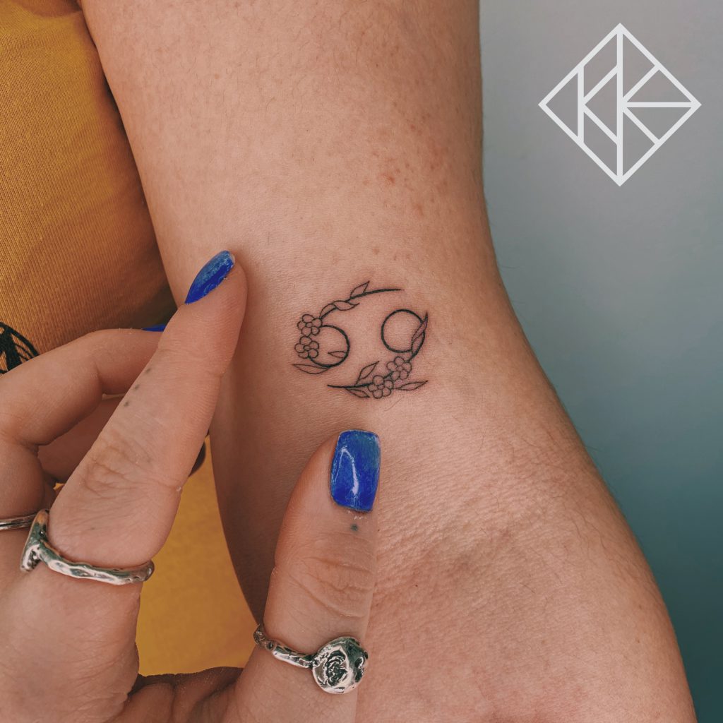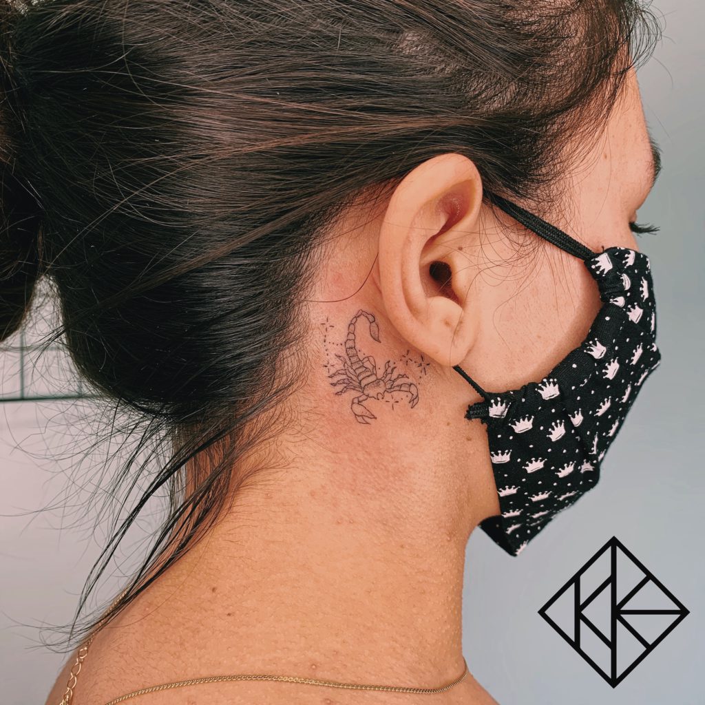 Karine tem 23 anos, é tatuadora há 3 anos mas desde criança já gostava de desenhar e sonhava em ser tatuadora. Seus estilos preferidos são Fineline, Pontilhismo e Blackwork. Suas tatuagens de signo misturam símbolos e constelações de forma bastante delicada e com um encaixe perfeito no corpo.