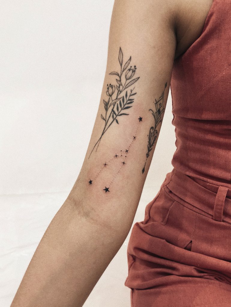 Bia tem 19 anos, é tatuadora há 2 anos e começou a tatuar por incentivo da sua mãe. Os estilos que ela mais gosta de fazer são Fineline, Escrita e Floral. Mas ela também arrasa nas tatuagens de astrologia, essas constelações de Touro, Escorpião e Áries mostram como incorporar o signo na tatuagem de forma delicada e apaixonante.