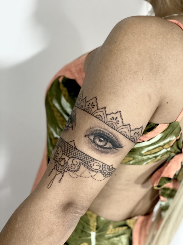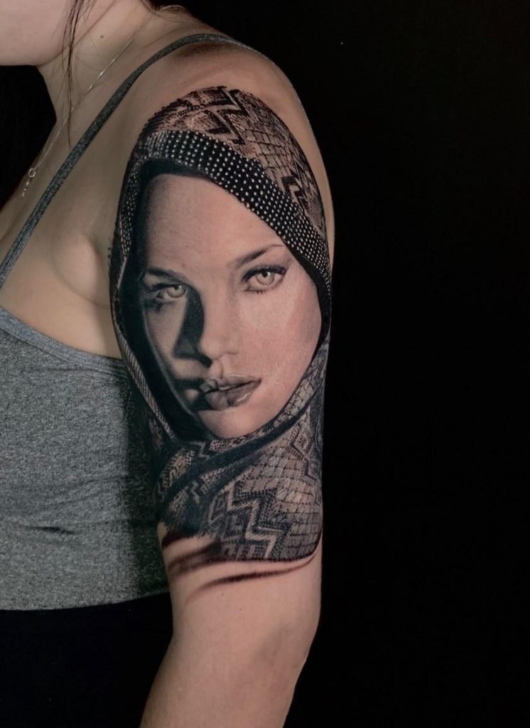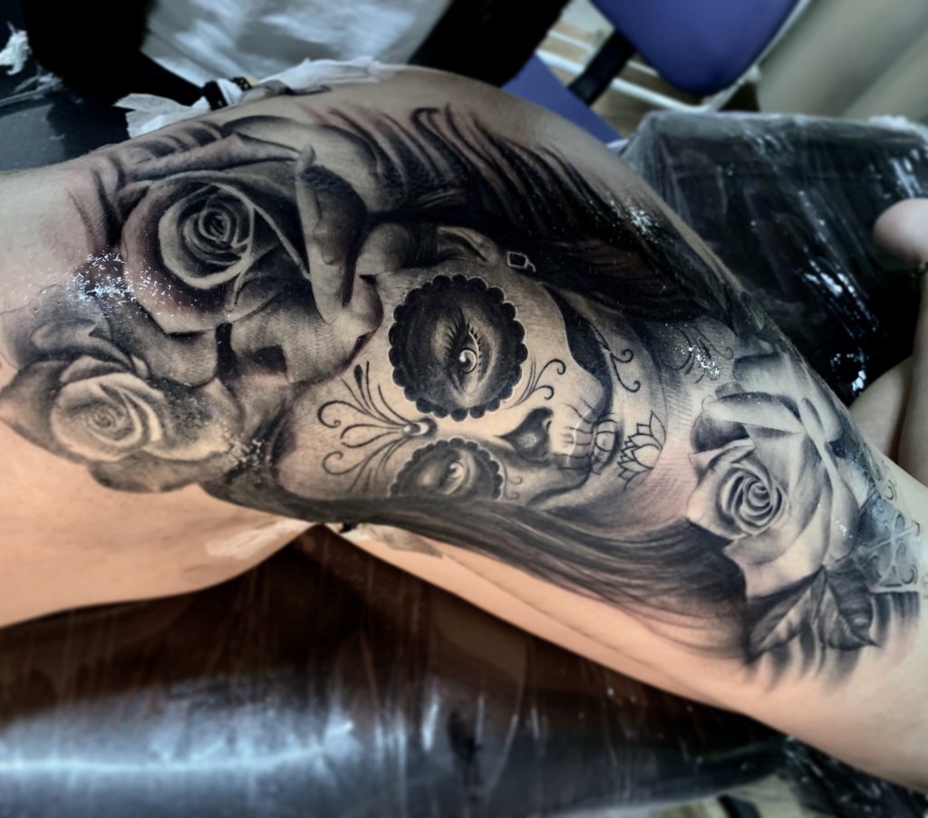 “Desde pequena sempre gostei de desenhar, mas nunca vi a arte como forma de ganhar a vida. Trabalhei muito tempo de carteira assinada e já cheguei a cantar na noite, até que um dia ouvi a seguinte pergunta: “O que você sabe fazer além de cantar?”, foi quando apresentei meus desenhos e decidi investir na tatuagem. Comecei minha carreira como tatuadora em 2016, e em 2018 me especializei em Realismo Preto e Cinza por conta do meu público alvo que sempre procurava por esse estilo. Minhas inspirações no Realismo são: Chico Morbene, Ubiratan Amorim, Samurai Standoff, Tobias Augustini, Douglas Prudente e Fred Tattoo.”