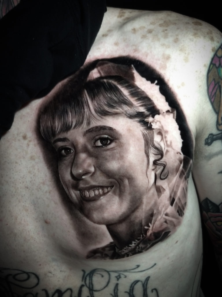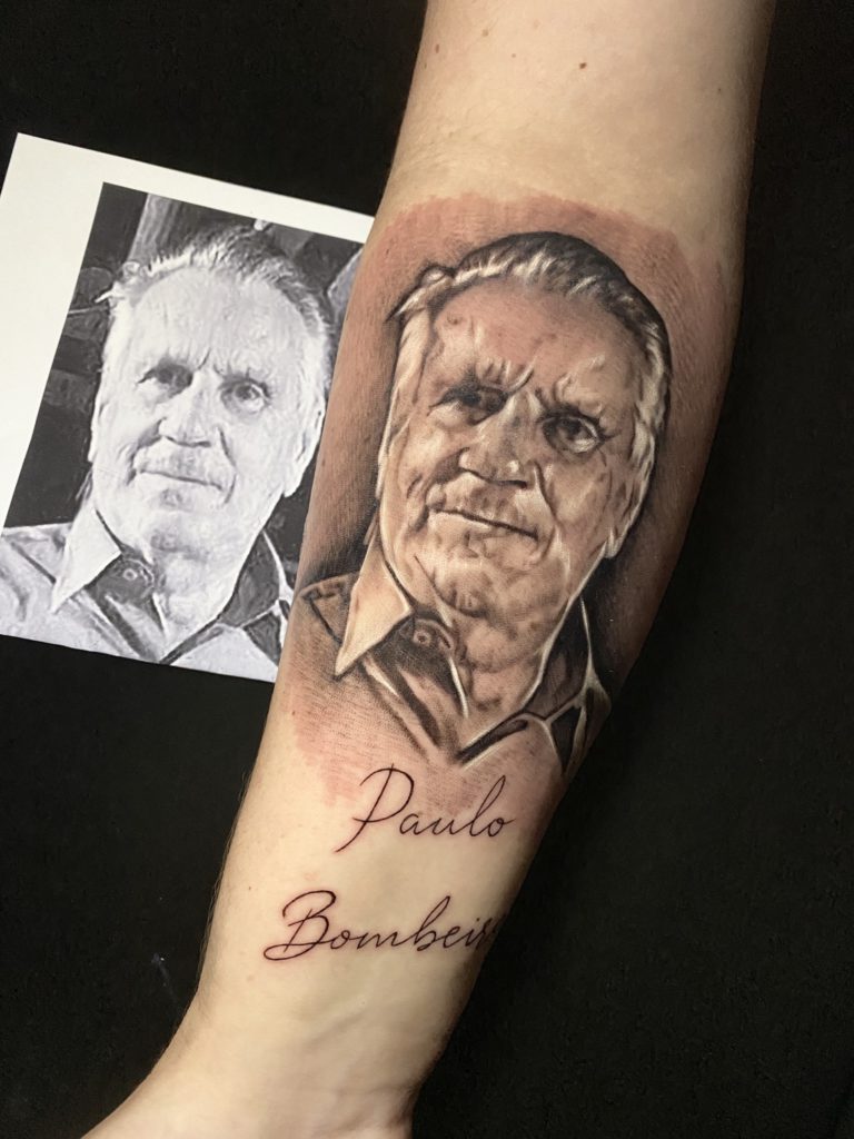 “Sempre amante de arte e quadrinhos, comecei desenhando com aquelas revistinhas de banca de jornal. Ao longo dos anos fiz vários cursos de desenho e dei aulas por anos até descobrir o mercado da tattoo pelo qual me apaixonei. Trabalho com realismo preto e cinza, estilo o qual me identifico mais. Entre minhas referências estão artistas como Thomás Carli, Eliot kohek, Tobias Augustini entre outros.”