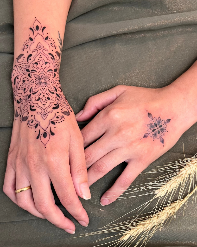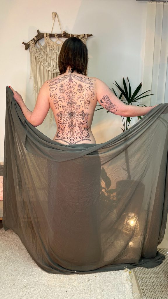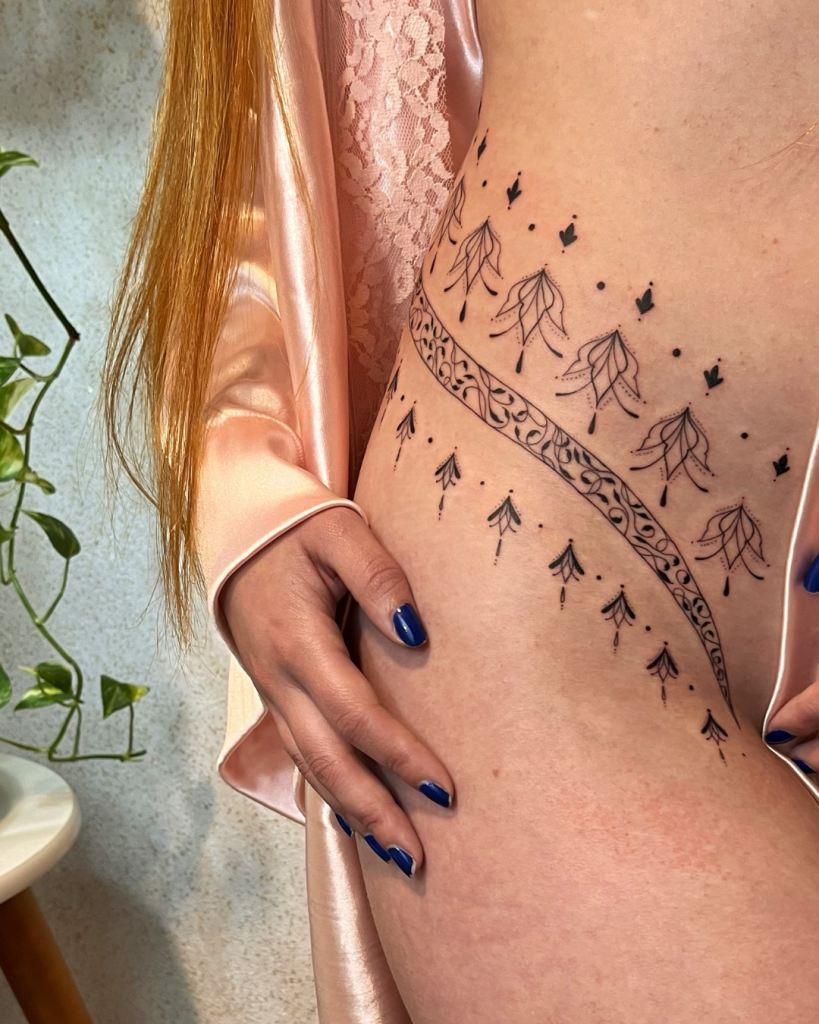 Valentina é uma talentosa artista de São Paulo que transforma o olhar das mulheres sobre si mesmas através de suas tatuagens ornamentais fineline. Com um vasto estudo sobre ornamentos na história da humanidade e um profundo contato com suas clientes, Valentina cria arte que valoriza e enriquece a identidade feminina. Seus ornamentos são meticulosamente pensados para se encaixar na anatomia de cada pessoa, destacando partes significativas e, por vezes, escondendo outras. Ela também adora misturar fauna e flora em seus designs, utilizando sombras suaves e delicadas para criar peças únicas e significativas.