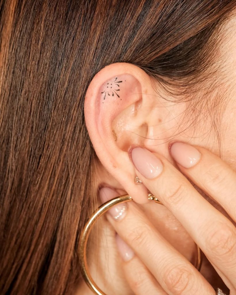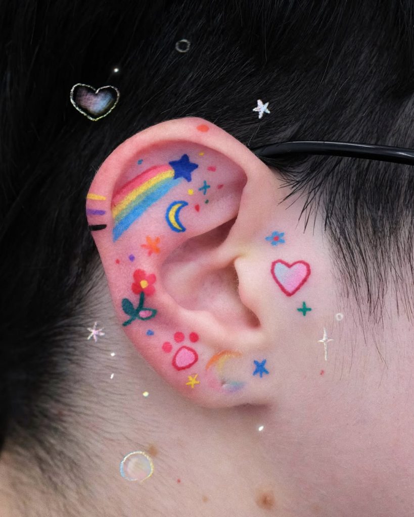 Os projetos de tatuagens nas orelhas estão ganhando destaque em 2025. Estas pequenas obras de arte complementam o visual de forma ousada, e as possibilidades são infinitas! Seja com projetos delicados ornamentais, elementos da natureza, blackwork cheios de impacto, ou tatuagens coloridinhas super fofas, todas são perfeitas para quem procura um local pra uma tatuagem supreendente e inusitada.