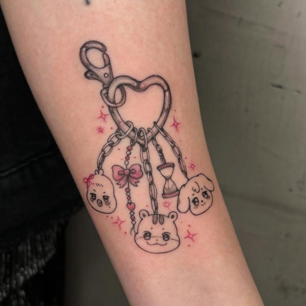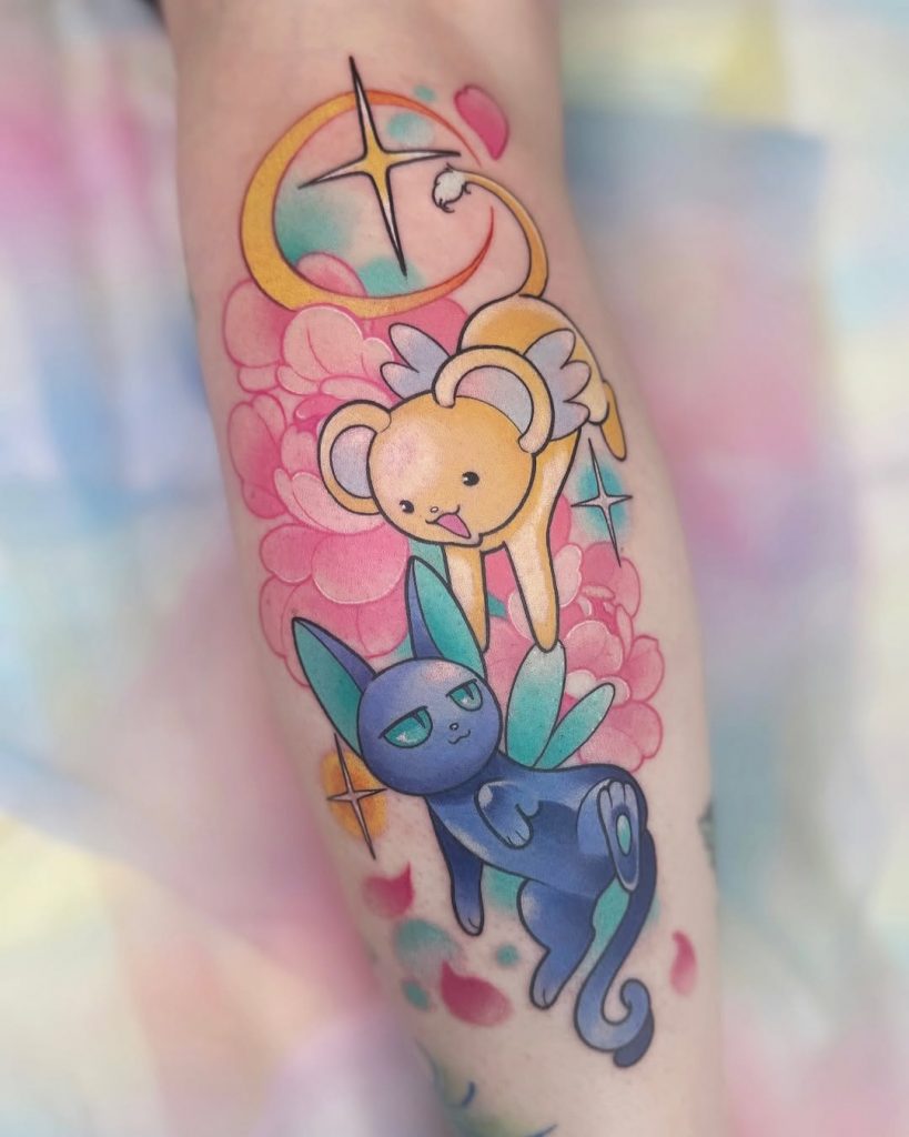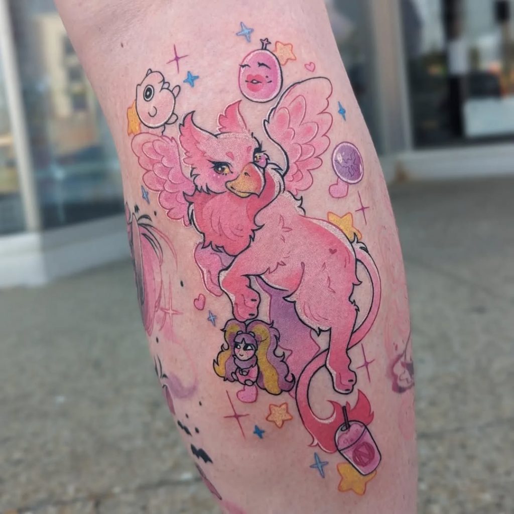 O estilo pastelcore é um movimento derivado da estética “kawaii” (fofa) e é bastante popular na moda, na arte digital e em subculturas da internet. Nas tatuagens, o estilo segue a mesma linha suave e delicada é marcado pelo uso de cores em tons pastéis, criando desenhos fofos, suaves e frequentemente nostálgicos. Os temas dessas tatuagens geralmente envolvem elementos que remetem ao universo kawaii, como corações, arco-íris, doces, nuvens e personagens adoráveis de desenhos animados ou jogos. O estilo pastelcore nas tatuagens também incorpora uma estética doce e lúdica, trazendo uma sensação de leveza e fantasia.