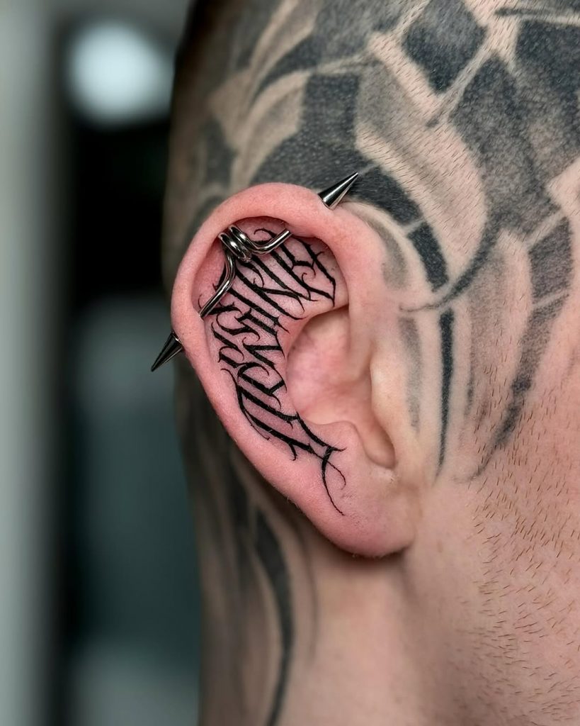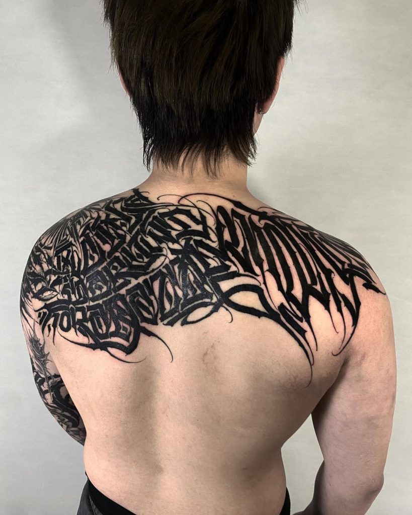 O estilo de tatuagem Dark Lettering Ornamental combina tipografias elaboradas com uma estética sombria, muitas vezes incorporando fontes góticas, traços pesados e detalhes intensos. Esse estilo tem um impacto visual forte, podendo ser focados em letras, frases, símbolos ou ornamentos, criando uma fusão entre o design tipográfico e a arte sombria, em projetos com uma estética misteriosa e dramática.