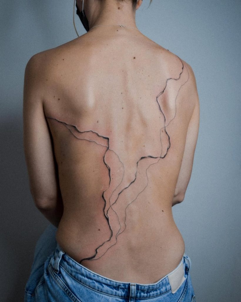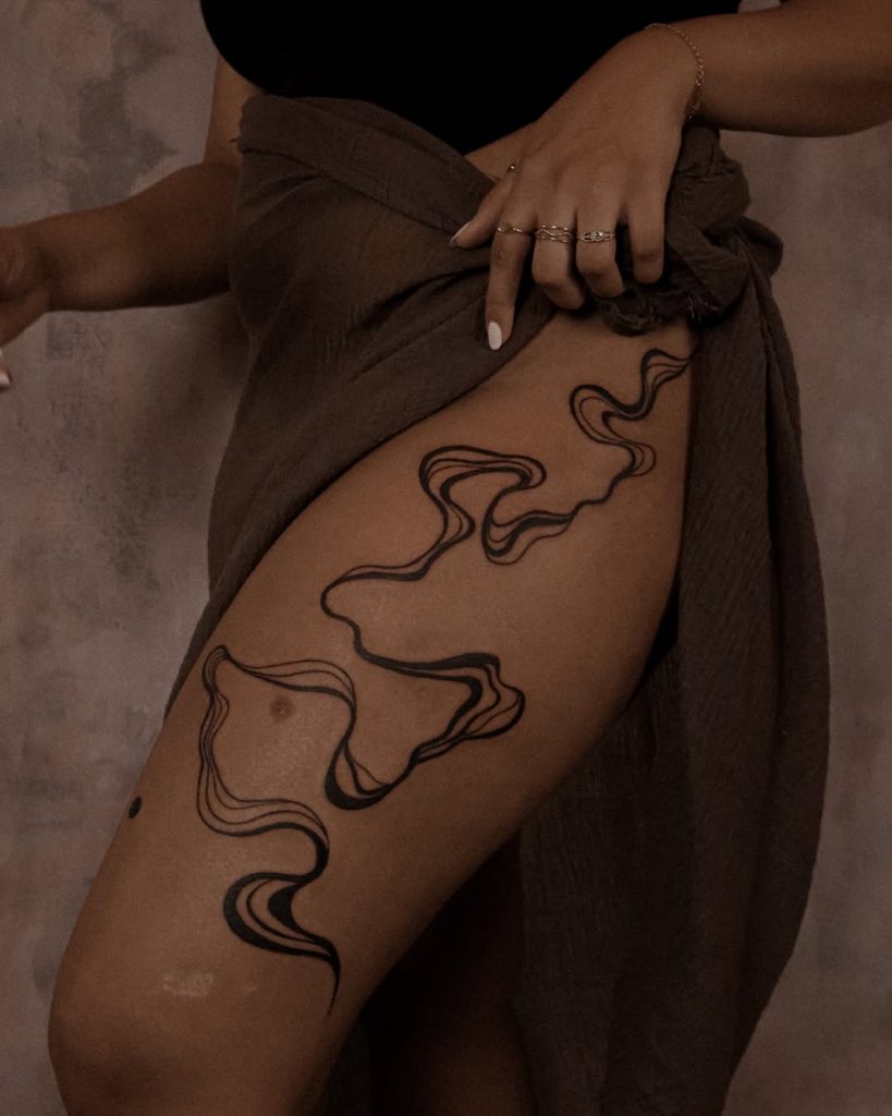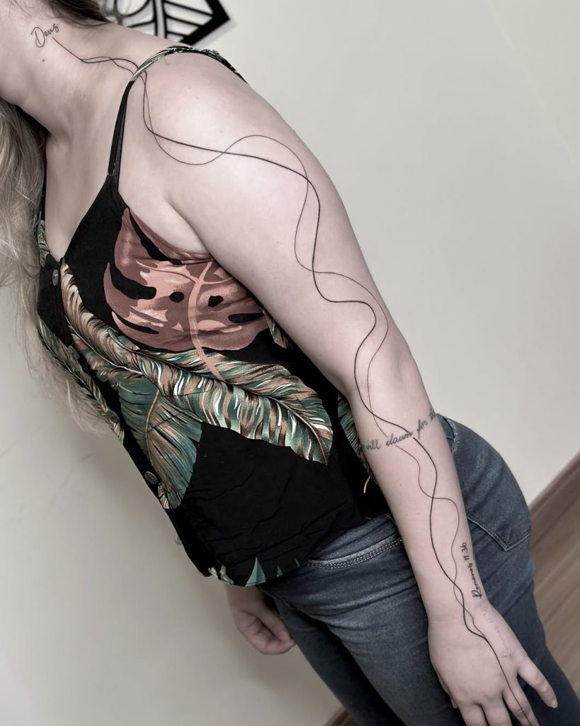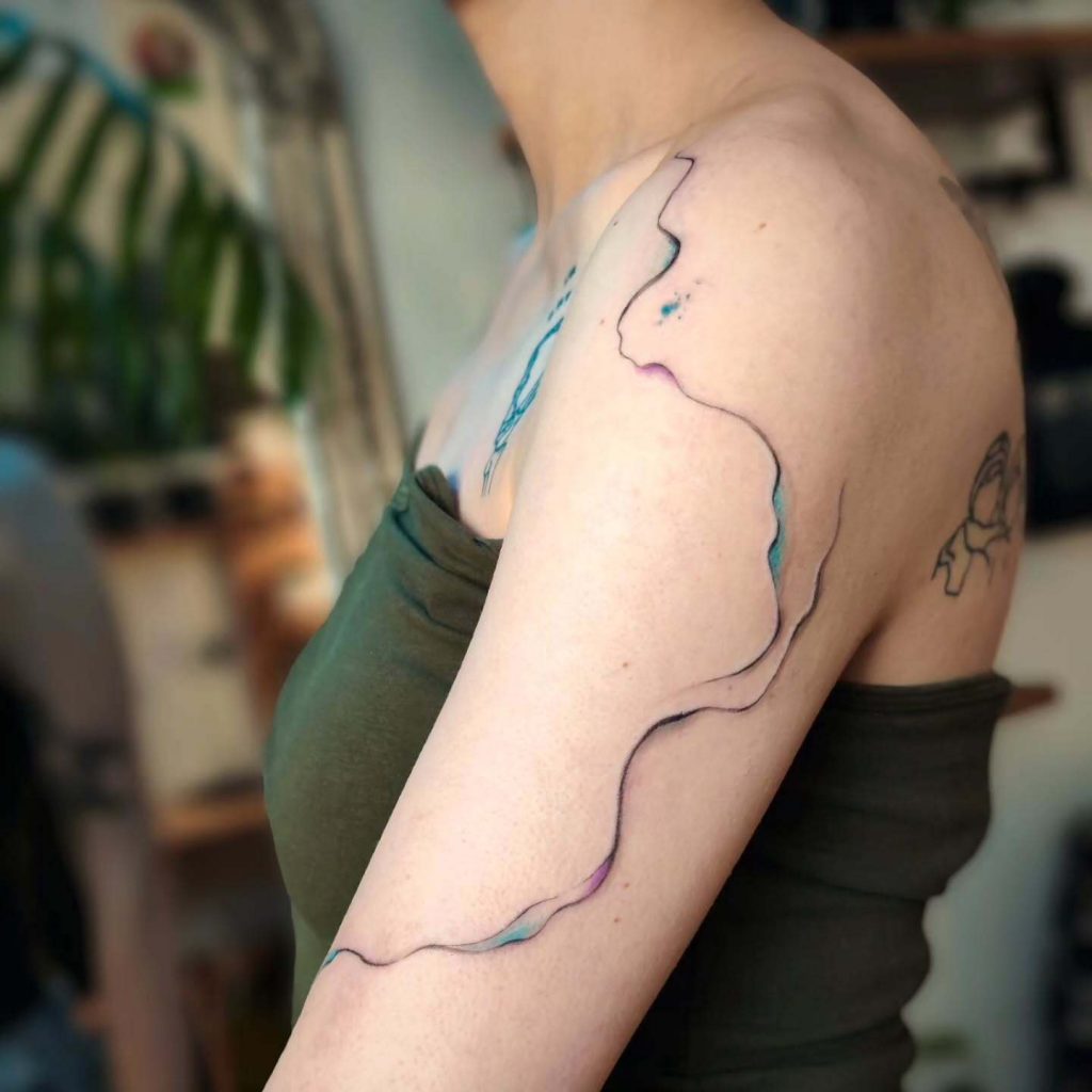 Um estilo que está em expansão em 2025 são as tatuagens em “Fluid Lines”, ou linhas fluídas. Esses projetos são caracterizados por linhas suaves e contínuas que fluem de forma orgânica pelo corpo, criando um design leve e elegante. Essas tatuagens buscam representar movimento, fluidez e harmonia com as curvas naturais do corpo, inspirado muitas vezes pela natureza como ondas ou correntes de vento. O resultado é único e visualmente hipnotizante, perfeito para os amantes de tatuagens abstratas.