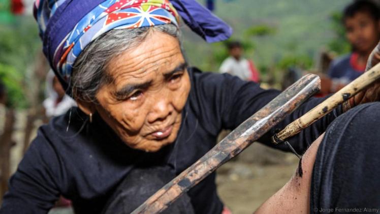 Como de costume no povoado de Buscalan, província de Kalinga ao norte das Ilhas Filipinas, as mulheres começavam a se tatuar bem cedo única e exclusivamente para finalidades estéticas, quanto mais tatuadas mais bonitas. Já entre os homens, a tatuagem significava honra e somente os guerreiros podiam se tatuar como prova de bravura, normalmente guerreiros que protegiam suas vilas matando inimigos.